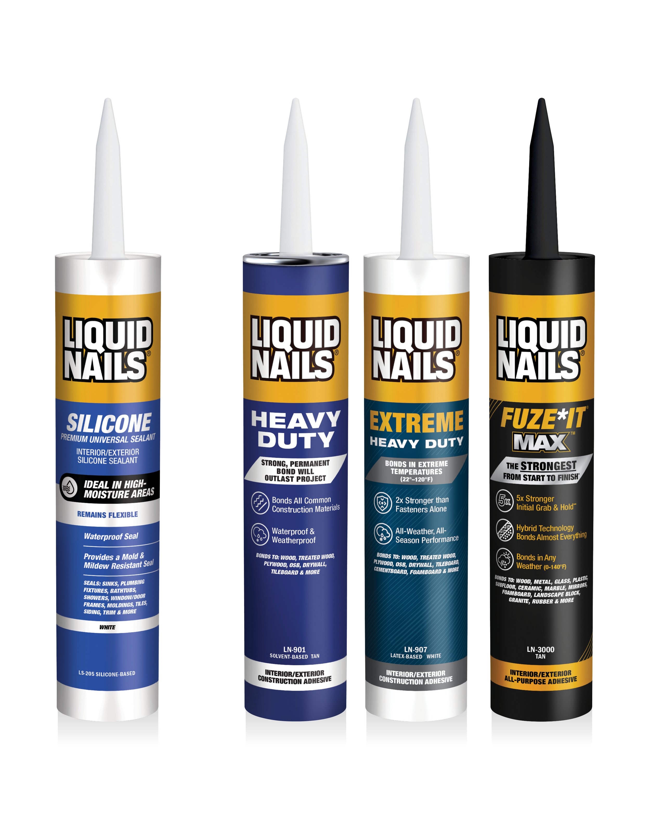 Liquid Nails is a brand that gets things done once and done right. In order to keep up with the brands strong, durable, and confident voice the packaging needed a refresh. The purpose of this refresh was to create a label with easier shoppability and a modern and durable look/feel that fits within our current adhesives family.